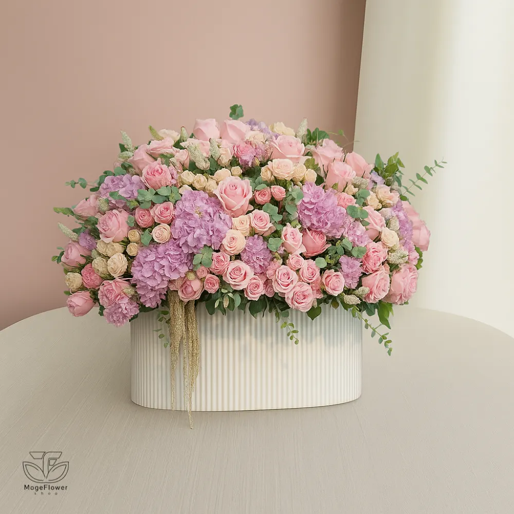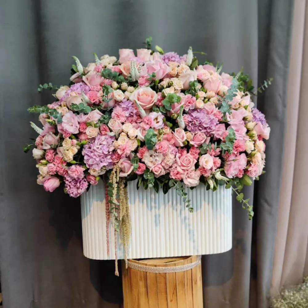 ترکیب گلهای نرم و رنگهای لطیف که حس آرامش و ظرافت را منتقل میکند و مناسب برای مناسبتهای ویژه است.