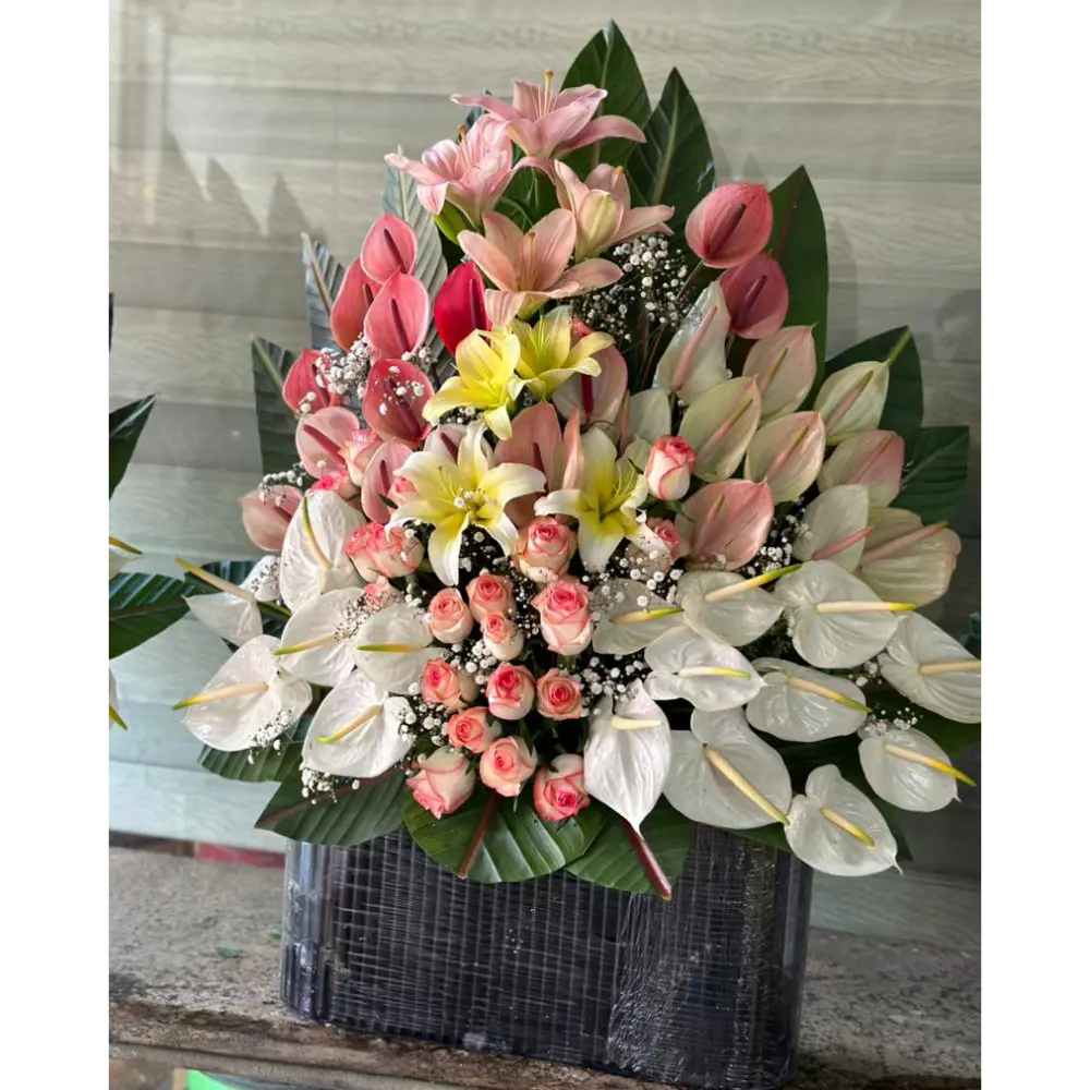 این باکس گل با طراحی عمودی و رنگبندی چشمنواز، مناسب مراسم رسمی و خاص است.