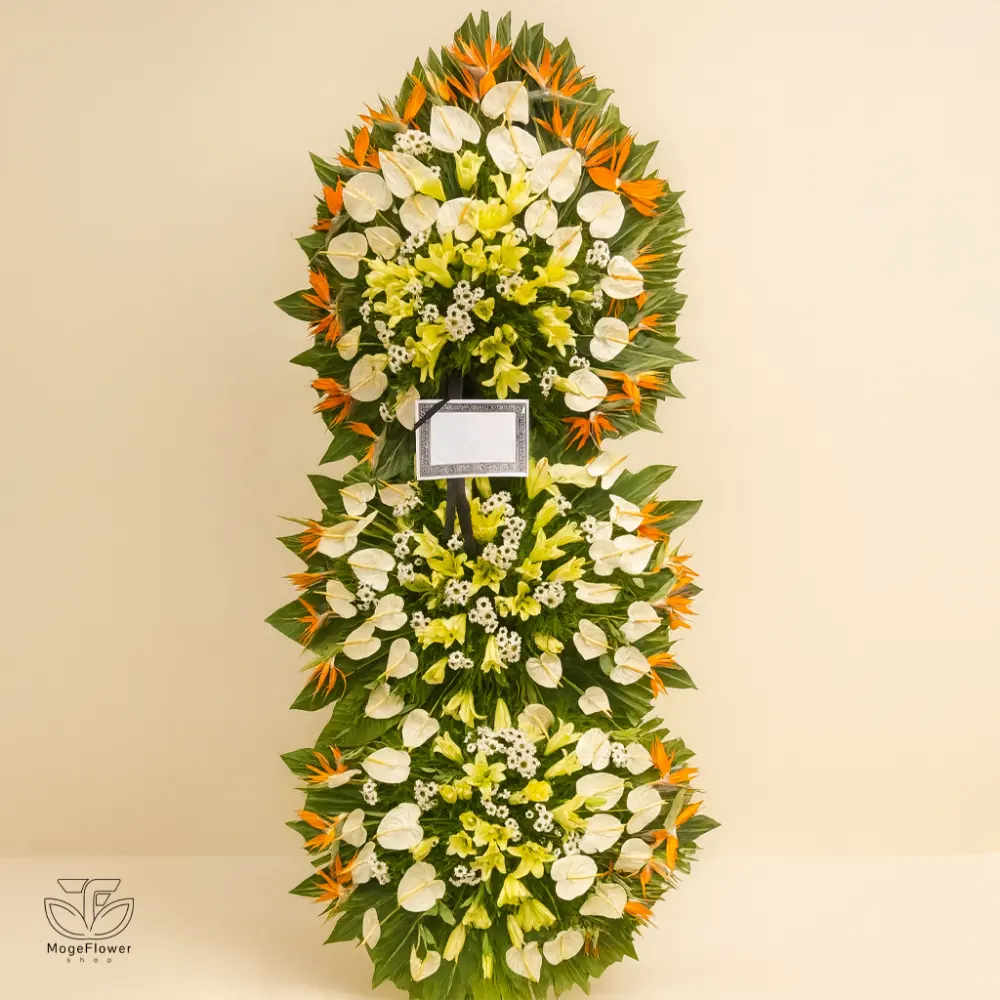 • تاج گلی دو طبقه با ترکیب خاص آنتوریوم سفید و پرنده بهشتی نارنجی، که با طراحی متقارن و رنگ‌های متضاد، جلوه‌ای باشکوه و متفاوت برای ابراز احترام و تسلیت ایجاد می‌کند.