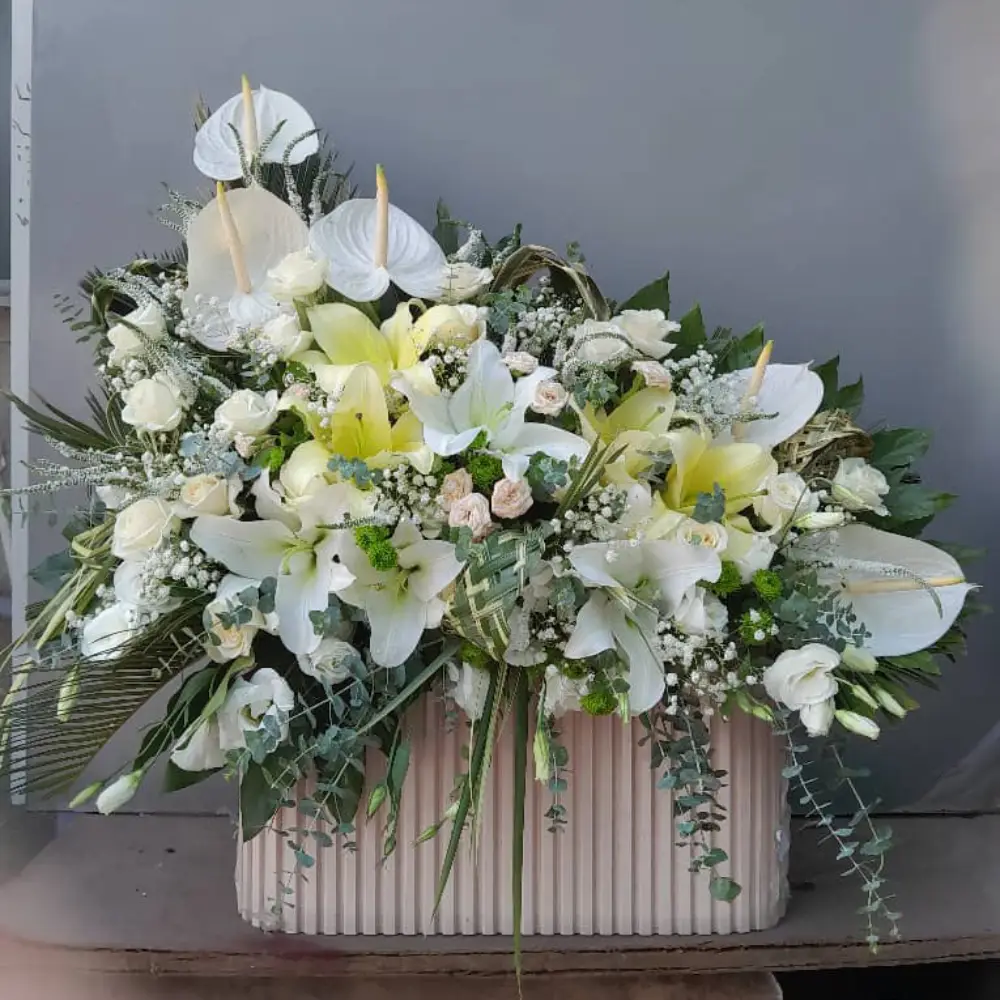 • این دسته گل با ترکیب گل‌های آنتوریوم سفید، لیلیوم سفید و رز سفید و صورتی، به همراه گل‌های Baby’s Breath و گیاهان سبز، ظاهری شیک و مجلل ایجاد کرده که مناسب برای مناسبت‌های رسمی و خاص است.