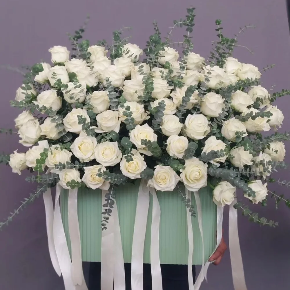 باکسی باشکوه با ترکیب گلهای سفید و کرم، مناسب برای مراسم رسمی و فضاهای خاص با چیدمانی لوکس و چشمگیر.