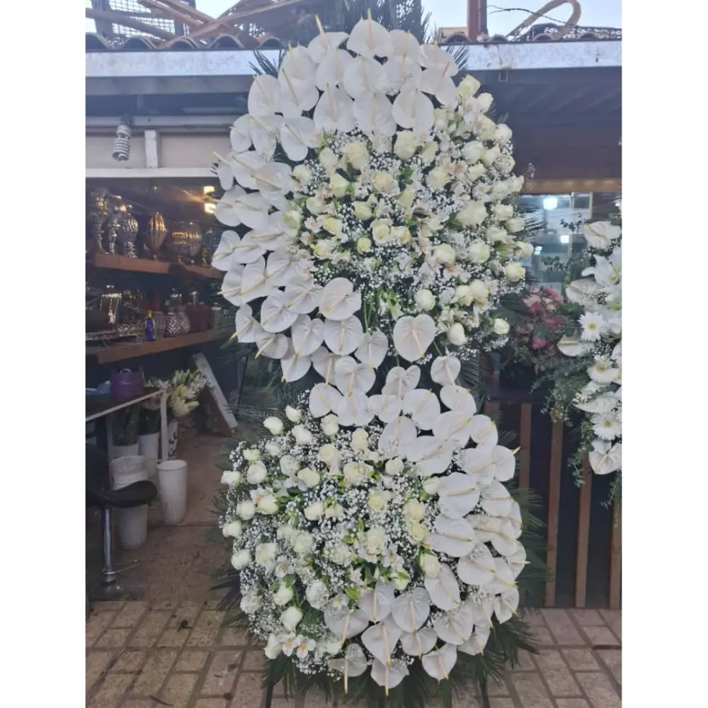 • ترکیب آنتوریوم سفید، گل رز سفید و ژیپسوفیلا سفید، شکوه و آرامش را به نمایش می‌گذارد و ظاهری زیبا و دلنشین برای مراسم‌های یادبود و رسمی ایجاد می‌کند. این تاج گل با طراحی ساده و شیک، فضای خاصی به مراسم می‌بخشد.